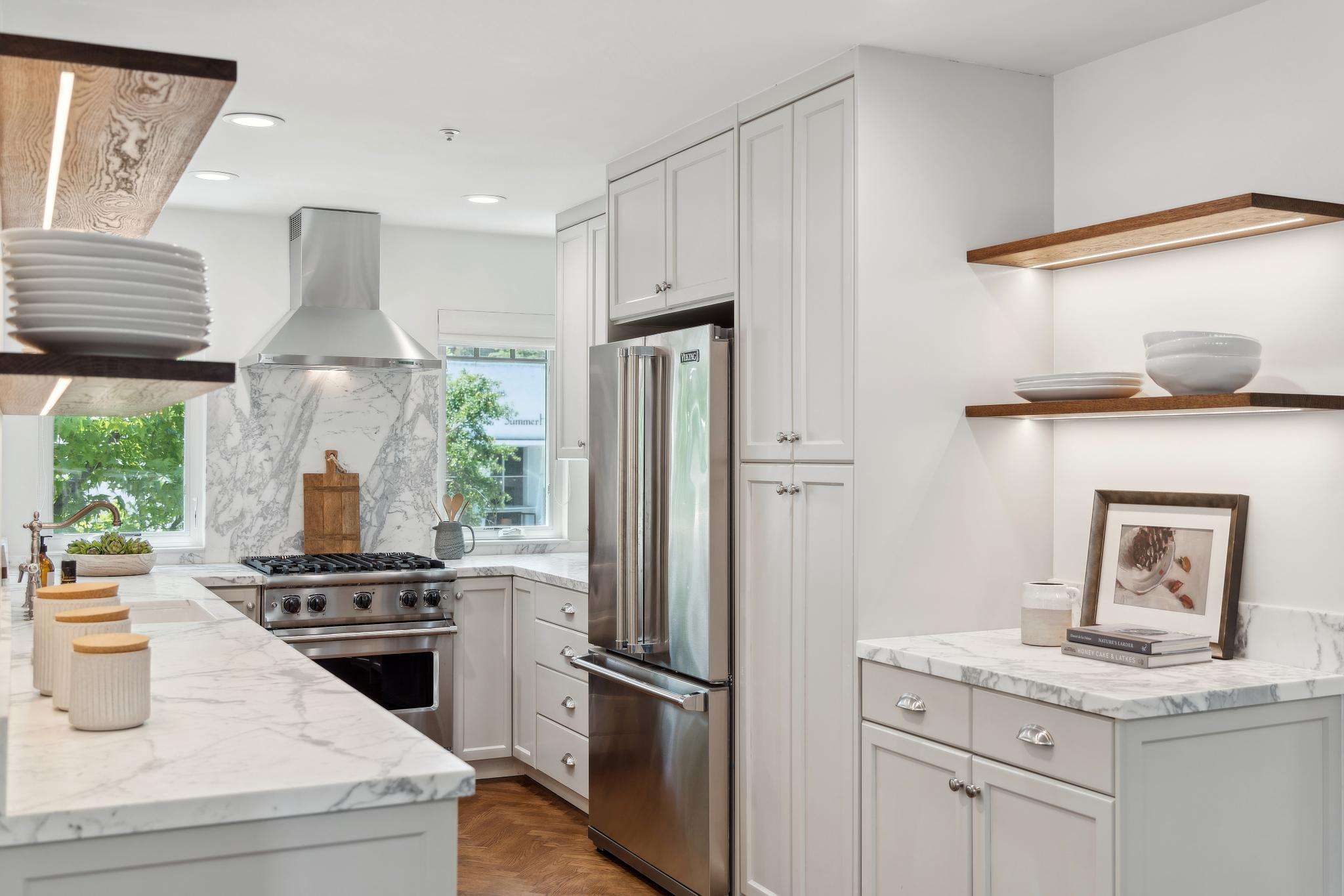 The kitchen has been reimagined with new appliances, striking marble countertops, freshly painted cabinets, and floating wood shelves that add organic texture and visual interest. A charming peek-a-boo pass-through connects the kitchen to the living room. Tucked just off the kitchen, the dining area is illuminated by a striking chandelier, casting a warm glow that elevates everyday moments and intimate gatherings alike. Two private terraces flank each side of the main level, extending the inside out.
